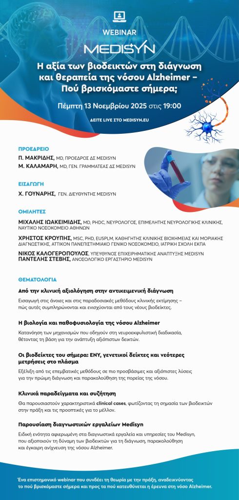 Webinar “Η αξία των βιοδεικτών στη διάγνωση και θεραπεία της νόσου Alzheimer – Που βρισκόμαστε σήμερα?” – Πέμπτη 13 Νοεμβρίου 2025 στις 19:00